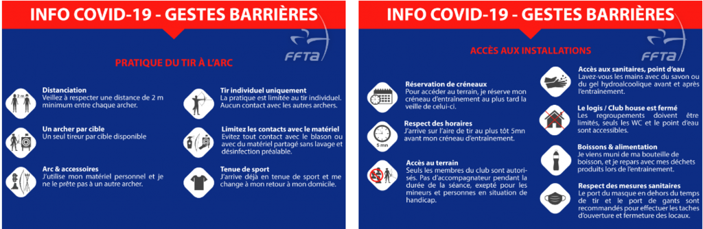 La Fédération Française de Tir à l’Arc (FFTA) a défini en accord avec le ministère des Sports des mesures barrières pour les clubs et les archers dans le cadre de la pratique du tir à l’arc. Ces consignes devront être scrupuleusement respectées par les différentes parties pour permettre le bon déroulement de l’activité dans des conditions sanitaires sécurisées. Un club ne pouvant pas mettre en œuvre ces mesures doit garder son terrain fermé.